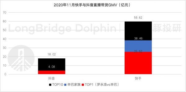 2019 年,辛巴个人带货 GMV 接近快手整体 GMV 的 1/3。根据海豚投研整理的数据,2020 年 11 月辛巴家族的直播电商 GMV 占快手前 10 名主播带货总量的 65%,快手直播的头部效应仍然未有较大改善。