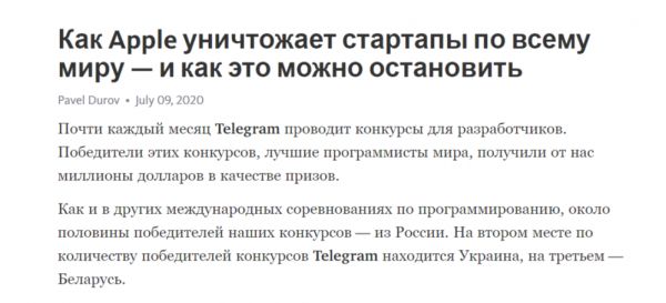 杜罗夫7月9日发表的长贴截图:苹果如何消灭全球创业公司,以及如何阻止它 / 网页截图
