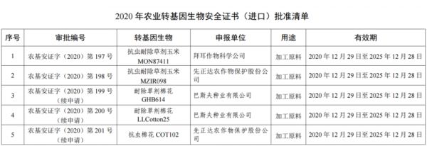 2020年农业转基因安全证书(进口)批准清单,来源:农业农村部