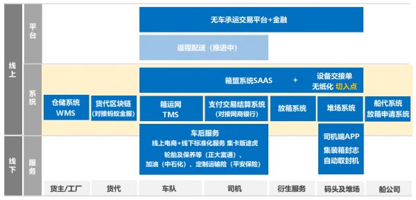 在集装箱卡车产业互联网平台方面,「箱盟集运」顺应近年来的集装箱单证无纸化政策,从“无纸化”切入开发配套工具和服务,用于支持车队和码头的日常运营,目前已形成一个覆盖智能派单、全程追踪、信息查询、TMS系统、放箱预录、承运开票、金融保险、自动取封、ETC等功能的互联网SAAS服务平台。该平台在上海港合计覆盖集卡车队超过3000家,其中活跃车队超过2500家,市占率近80%,是上海港外最大的集卡运输数据平台公司。