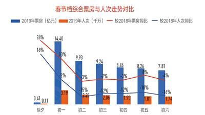 2019年春节档有8部影片扎堆上映,但上座率同比出现大幅滑坡。前5天全国上座率与2018年相比,下降了近13个百分点;2月4日至2月10日,观影人次同比下降1500万人次。来源:猫眼数据