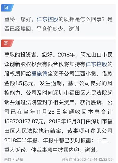 不久之前,仁东控股暴雷,爱施德小贷业务接受的股权质押发生逾期,最终仅依靠诉讼收回本息。虽然此次风险被有效化解,但仍无法保证类似的情况不会再次出现。