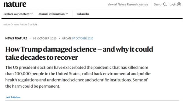 但显然,科技顾问并不能影响特朗普的抉择。不久前,《自然》杂志盘点了特朗普退出巴黎气候协定、削弱环境保护和公共卫生法规、延误疫情防控等对美国科学造成损害的关键事件,并表示这四年对美国科学界的伤害需要数十年的修复。