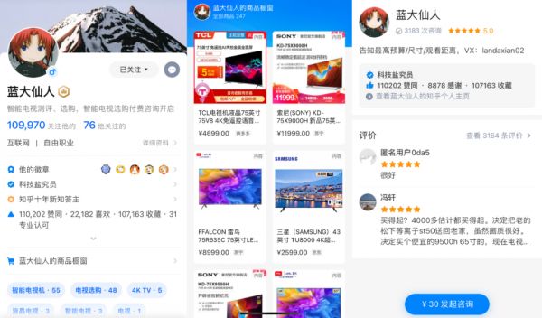 但在去年1年,知乎却主动推出了「好物推荐」功能,在回答中插入商品卡片,创作者可因用户下单获得返佣。在周年大会上,大V蓝大仙人分享了,一篇智能电视选购文促成5000万+带货交易额的案例,让全职从事知乎带货成为可能。