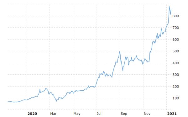 两天后,1月7日,特斯拉股价突破了800美元的关口。