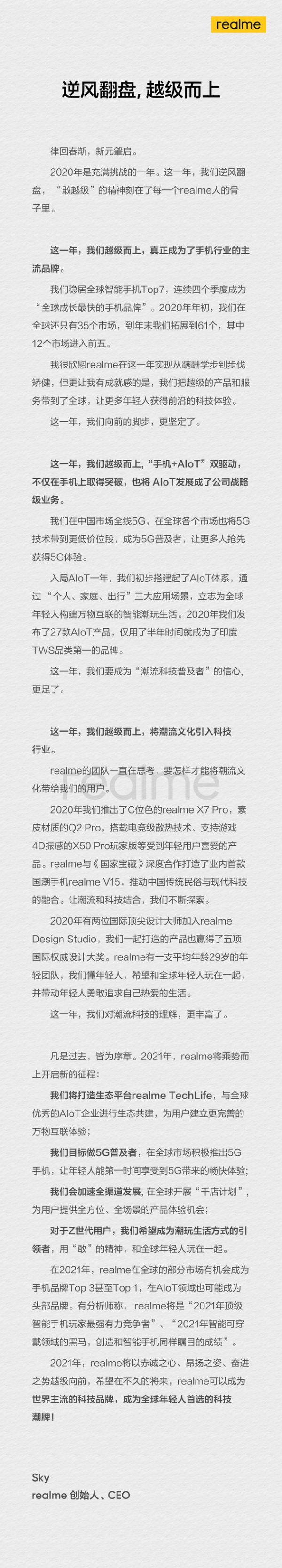36氪获悉,realme手机创始人李炳忠发布新年公开信总结了2020年的成绩、2021年的目标。