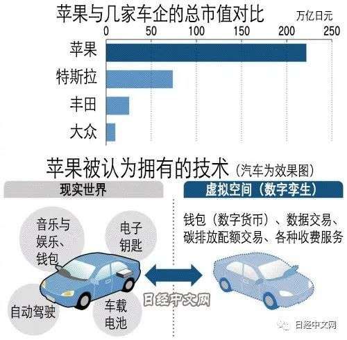 苹果的野心恐怕并非现实世界,而是汽车这个硬件背后的网络空间。最初,苹果也许率先推出音乐和娱乐等让人在车内感觉舒适的设备和服务,但最后将扩大至在互联网上重现现实世界的“数字孪生(DigitalTwin)”、采用区块链技术的行驶数据交易、数字货币交易、结算和收费服务。无疑将通过这些服务,打造苹果和用户在网络空间分别激活经济活动、共同受益的商业模式。