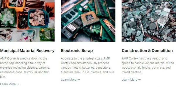 AMP机器人可挑拣出的垃圾种类很多,包括金属、电池、电容器、塑料、多氯联苯、电线、纸箱、纸板,杯子、贝壳、盖子、铝等,还包括金属混合木、沥青、砖、混凝土、塑料和混合物(如聚对苯二甲酸乙二醇酯、高密度聚乙烯、低密度聚乙烯、聚丙烯、聚苯乙烯)等。同时它还会将薄膜按照颜色、清晰度和透明度分类。