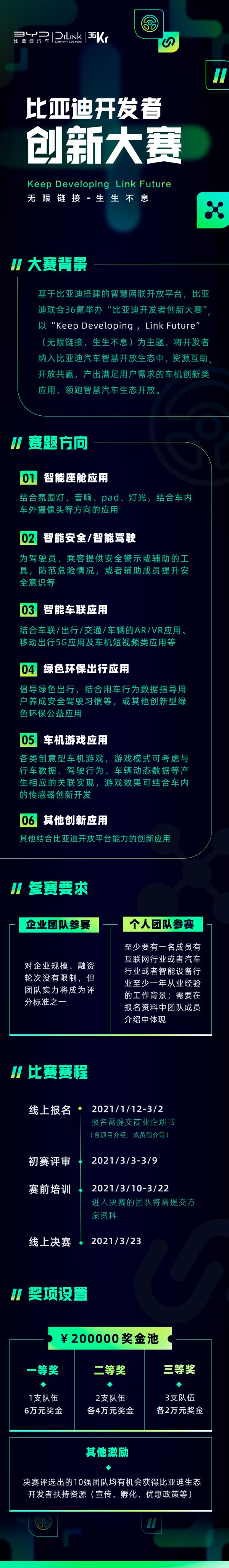 查看长图了解更多比赛详情,点击下方报名链接即刻参赛,通过比亚迪这个强大的舞台,来一起完成创新应用的探索,让汽车将变成一个可移动的智能空间。