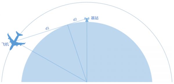 如下图所示,从基站的高度向地球作切线,并延长该线直到和飞机在天上的巡航高度相同,便得到了基站的天空覆盖半径:d=d1+d2。