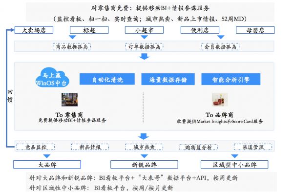 简单来讲,「马上赢」通过免费的BI和情报换取零售商的终端动销数据,数据脱敏后,为品牌厂商提供快消雷达服务进行商业变现,做的是“收数-卖数”的生意。