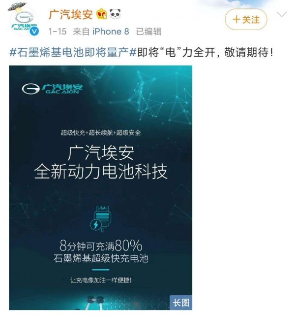 本月15日,广汽埃安发布了所谓的“黑科技”宣传海报——一款超级快充电池,既搭载了石墨烯基又可实现8分钟充满80%的电,能量密度可提高到280Wh/kg左右。更重要的是,搭载这款电池的新能源汽车NEDC续航里程将达到1000公里。