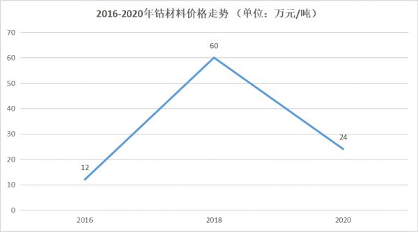 2016-2020年钴材料价格走势,数据来源于EVTank,连线出行制图
