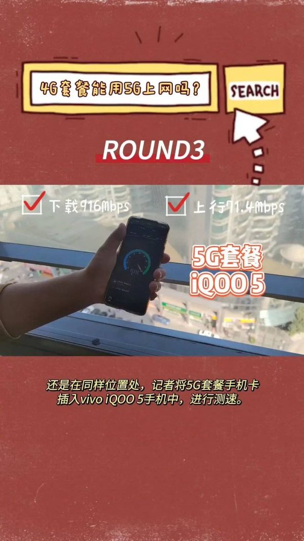 还是在同样位置处,记者将5G套餐手机卡插入vivo iQOO 5手机中,进行测速。结果显示,下载速率达到916Mbps,上行速率为71.4Mbps。