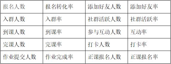 主要关键数据在:报名人数;报名转化率;添加好友人数;添加好友率;入群人数;入群率;社群活跃人数;社群活跃率;打卡人数;打卡率;作业提交率;作业提交率;完课人数;完课率;正课报名人数;转化率。