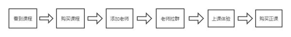 科学的训练营用户路径能大大提高训练营的转化率,我们先看一下训练营的用户路径是怎么样的?分析了上百家的训练营,得出的训练营路径一般是:看到课程-报名课程-添加老师-老师拉群-上体验课-购买正课,转化的提高就要靠在各个节点的转化率。