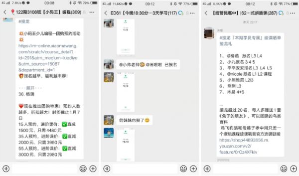 我们常见的是群内和直播中邀请往期优秀学员分享和官方优秀学员展示,还有利用长期班班群里的上课感悟,让其它用户的认可塑造好的口碑。