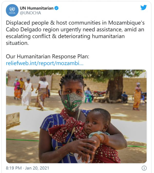 @环球网【联合国称武装袭击迫使莫桑比克超过56万人逃离家乡】当地时间1月20日,联合国对莫桑比克德尔加杜角省暴力升级引发的人道主义危机深表关注。联合国发表的声明中说:“冲突不断升级,德尔加杜角的人道主义局势恶化,完全依赖人道主义援助。”