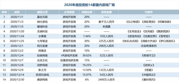 而腾讯对于国内中小厂商的投资则集中在2020年底。据统计,在去年11月和12月内腾讯共投资了14家中小厂商。