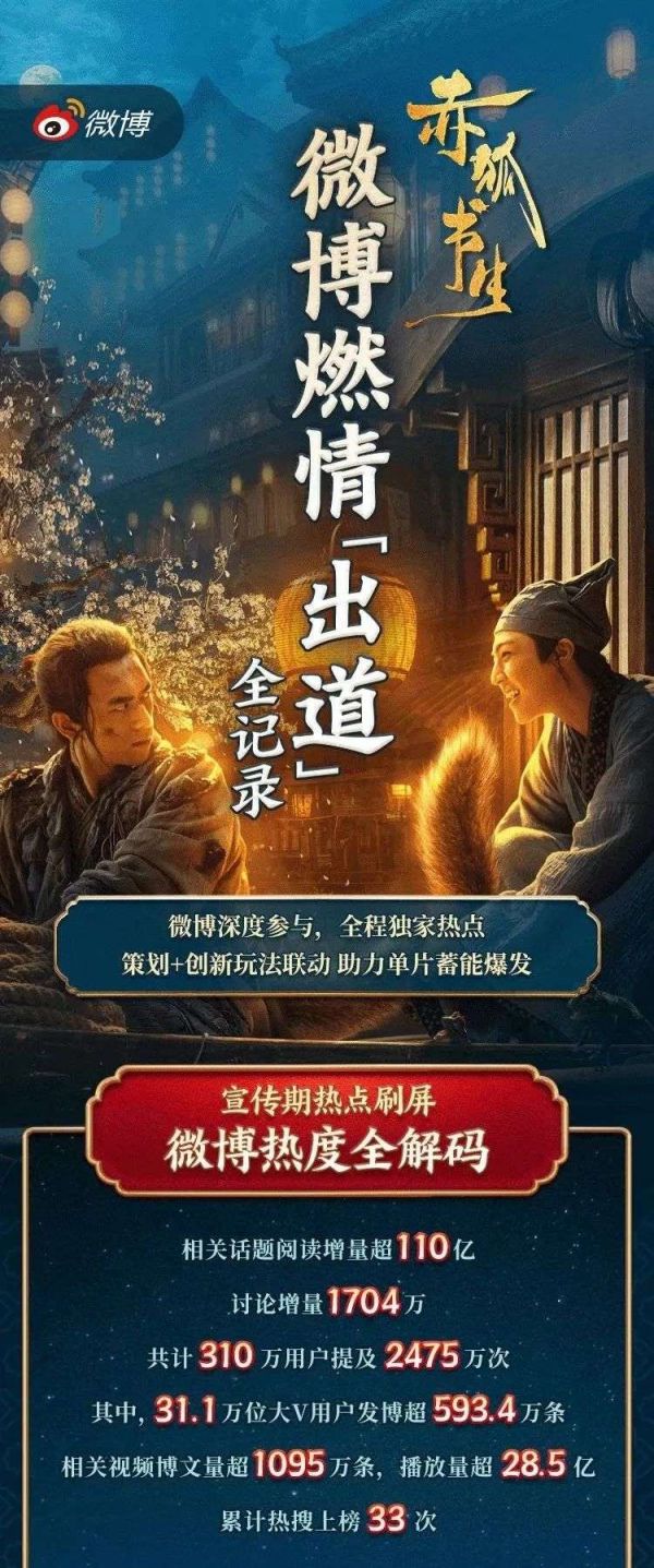 具体到电影营销服务。在电影物料分发环节,微博往往通过匹配话题引导服务提升影片热度。影片上映期,微博通过调动平台内明星资源,号召明星大V铺垫影片口碑,并推出明星直播、明星扫楼等多元的宣传手段。