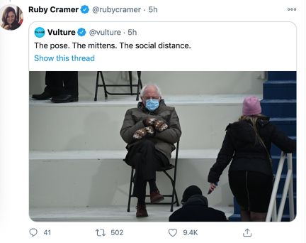 还有网友发现了不走寻常路的“酷大爷”桑德斯。除了很real地穿上他的经典保暖外套外,他手上非常“反差萌”的连指手套也吸睛无数。有网友表示,“完了,我不能专注看就职典礼了,现在满脑子都是桑德斯的连指手套!”