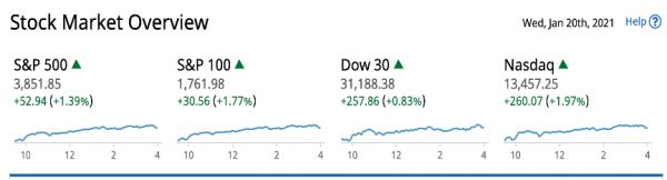 图 1月20日三大股指上扬,图片截自于雅虎财经