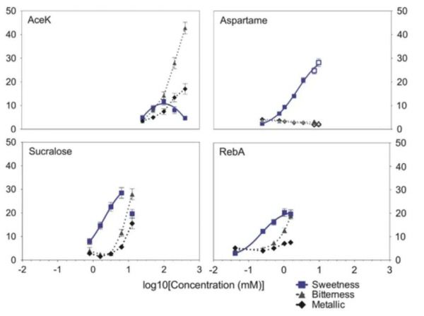 比如在甜味剂实验中,有部分参与者指出,随着三氯蔗糖、AceK和RebA浓度的增加,甜味趋于稳定,味道变得更加苦涩。Ace K是一种人造非营养性甜味剂,通常存在于碳酸软饮料和其他产品中。非营养性甜味剂是具有没有卡路里的甜味剂。虽然有些人发现Ace K甜,但其他人却觉得既苦又甜。