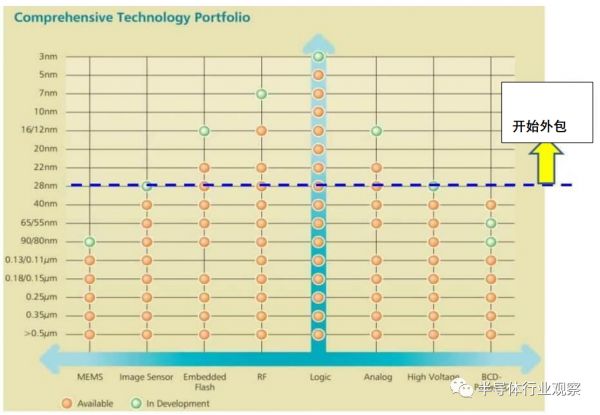 换言之,采用45-40纳米传统工艺的车载半导体由瑞萨自行生产,28纳米以后的需要尖端工艺的车载半导体全部委托给TSMC生产,即瑞萨成为了名为“Fab Lite”的半导体厂家。(如下图1)