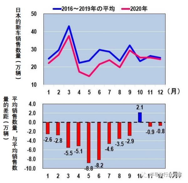 此处,比较2016年-2019年每月新车平均销售数量(以下简称为:平均数量)与2020年的销售数量后,得出下图4的上半部分。此外,且笔者将二者的差(即2020年每月的平均销售数量到底下滑至何种程度)制成了下图4的下半部分。