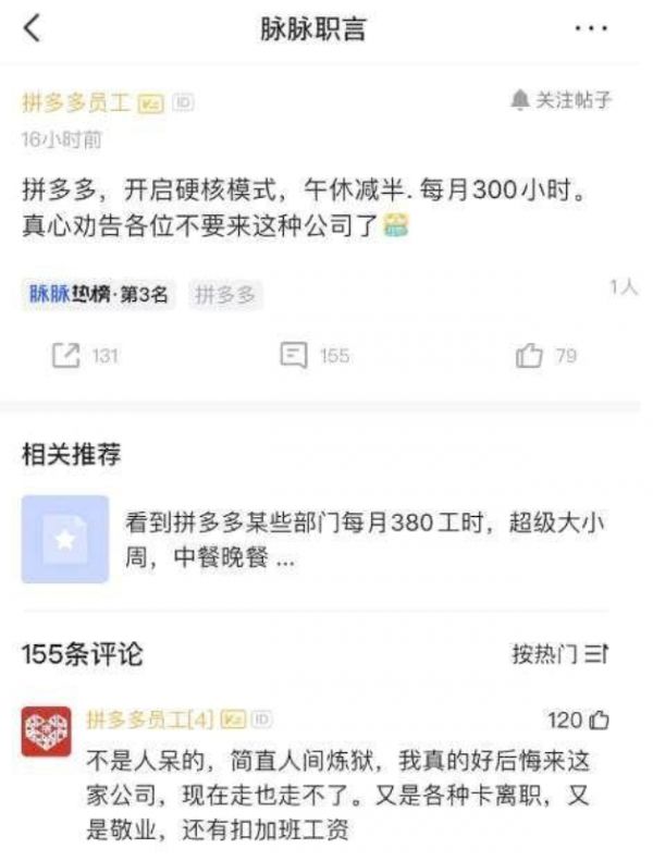 在知乎、脉脉等平台上,有拼多多员工匿名爆料每月最低300工时等新规,正是 “ 硬核奋斗模式” 的具体表现。要达到每月300小时的工作标准,每天工作10小时也要全月无休才能完成,工作强度甚至比“996”工作制更为硬核,也为后来的事件埋下了隐患。