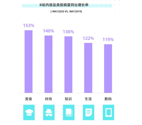 但事实上,在这份数据报告里,却是美食、时尚、知识、生活等泛生活方式类内容投稿量同比增长率要高。其中,美食和时尚以153%和140%的同比增长率位居B站内容品类投稿量同比增长排行之首。