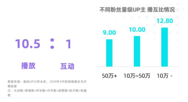结果显示,B站视频内容「平均每10次播放就会收获一次互动,并且,不同粉丝量级的UP主,播互比表现相差不大。」这或许部分揭示了B站中小UP主也能频繁接到商业合作邀约的原因。