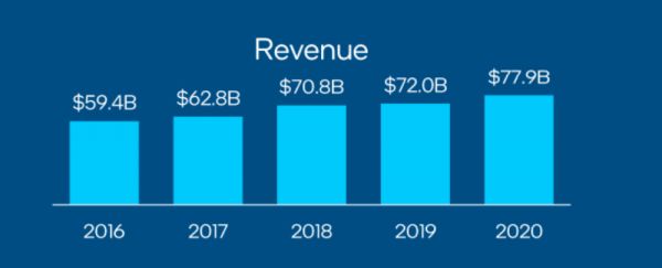 从最新公布财报来看,英特尔营收连续5年实现正增长,在2020全年营收达779亿美元(约合5043.56亿人民币),同比增长8%;净利润为209亿美元(约合1353.15亿人民币),同比下降1%。