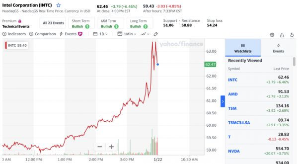 芯东西成文时美股已经收盘,英特尔股价报收每股62.46美元,市值为2559.61亿美元。