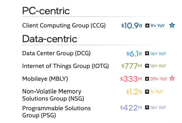 细分来看,英特尔数据中心业务包括数据中心事业部(DCG)、物联网事业部(IOTG)、自动驾驶子公司Mobileye、非易失性存储与解决方案事业部(NSG)、可编程解决方案事业部(PSG);PC中心业务包括客户端计算事业部(CCG)。