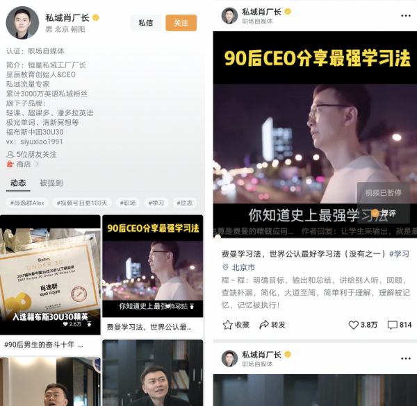 “私域肖厂长”目前是视频号职场内容的头部账号之一。肖逸群更主要的身份是90后创业者,其创办的星辰教育涵盖了职业培训、语言学习、兴趣学习等内容。他在2020年6月发布了第一条介绍“费曼学习法”的短视频,该内容在三天后迅速破圈,七天后拿下7000个赞。