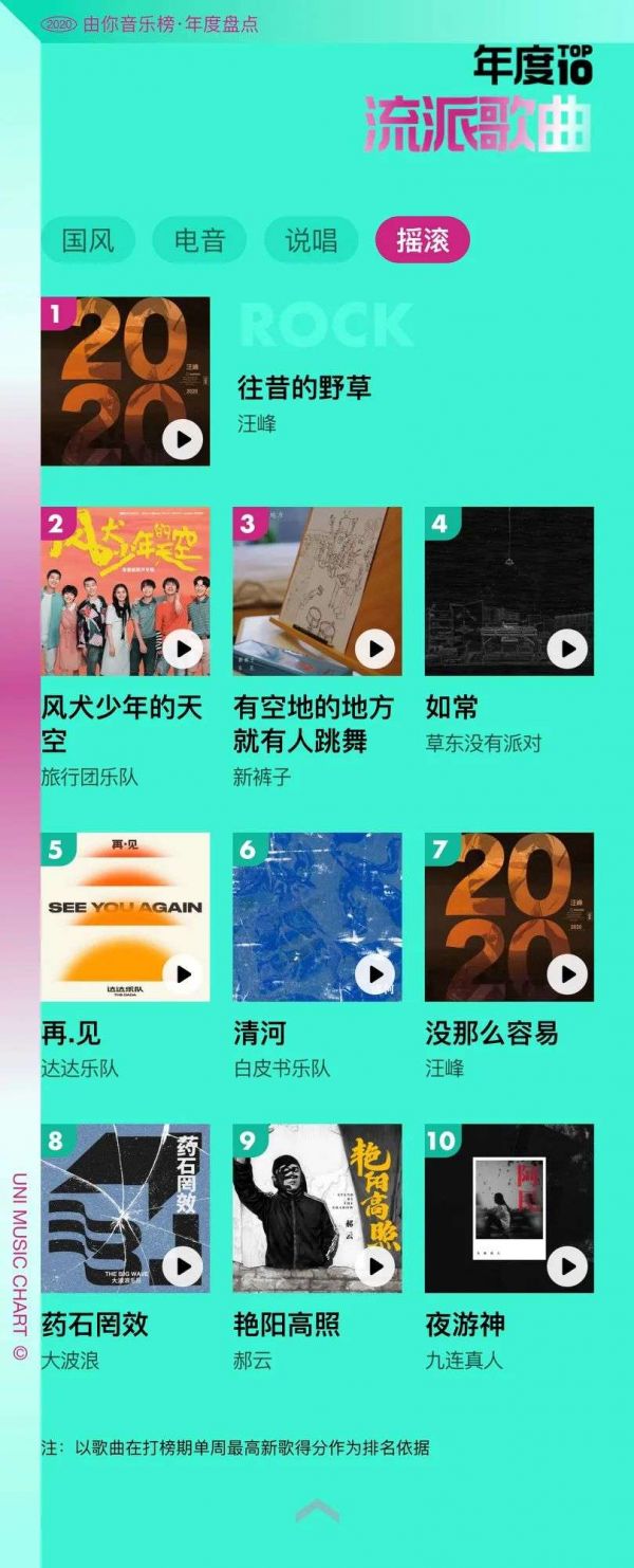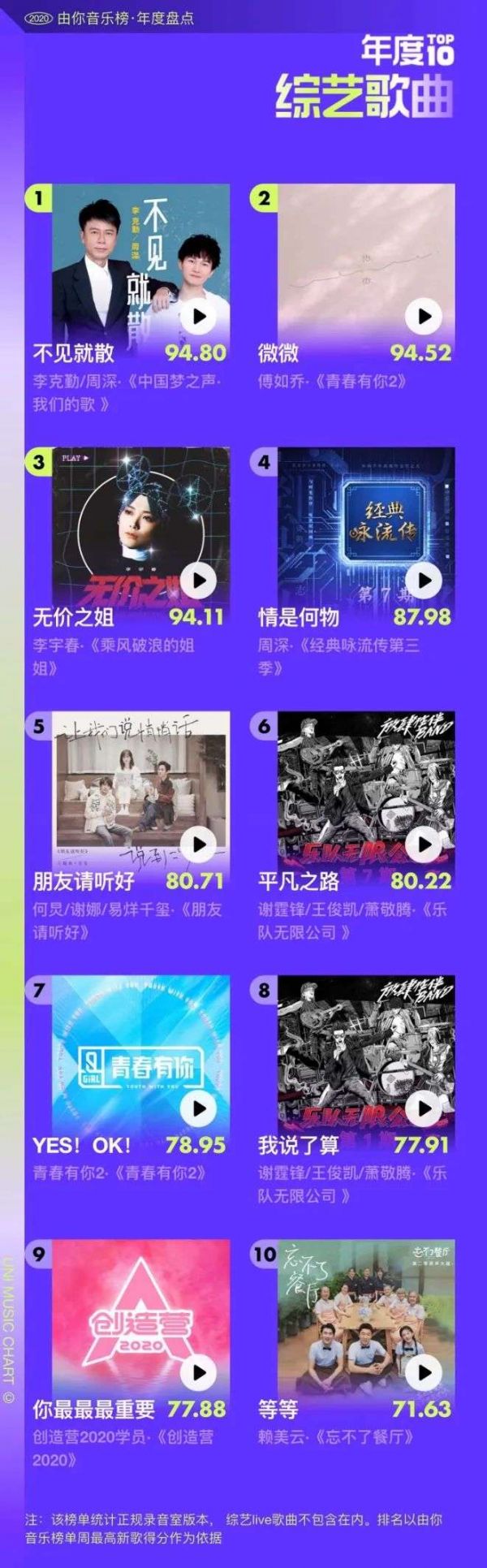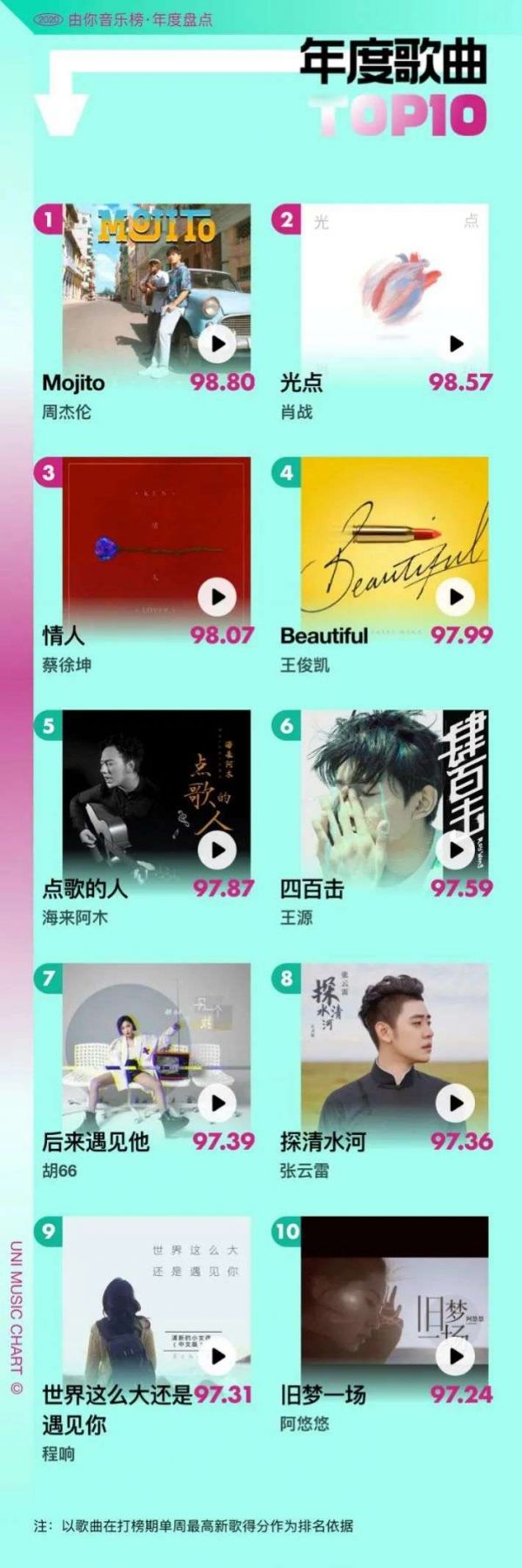 近期,“由你音乐榜”(UNI-CHART)就发布了2020年度盘点,从歌曲、歌者、听歌的人(用户)、多领域音乐(跨界)、月份牌(时间)等多个维度,回顾和总结了2020年华语音乐的全貌。
