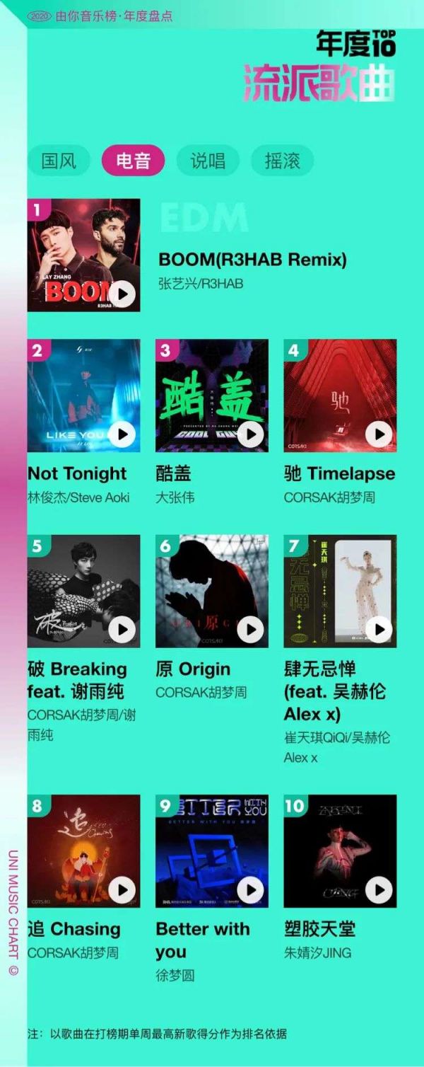 年度电音TOP10中,音乐人CORSAK胡梦周的表现相当抢眼。10首年度电音歌曲,CORSAK胡梦周独占其中4席,原创歌曲《驰Timelapse》、《原Origin》、《追Chasing》,与谢雨纯的合作曲《破Breaking》均榜上有名。作为突破的新生代音乐人,CORSAK胡梦周也将登上1月23日即将举办的TMEA腾讯音乐娱乐盛典的舞台。