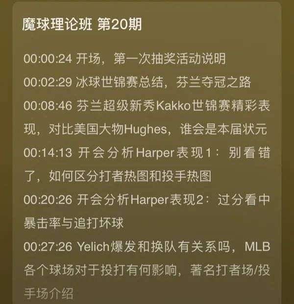 比如,在第20期节目中,他们通过MLB费城人队球员Harper的表现详细讲述了打者热图和投手热图的区别,也通过酿酒人队球员Yelich转会后的表现提升分析了大联盟中球场差异对投手、打者的影响;橄榄球部分讲解了NFL联盟的工资制度;冰球部分则是对2019年世锦赛的全面总结以及热门球员Kakko、Hughes技术特点的分析。