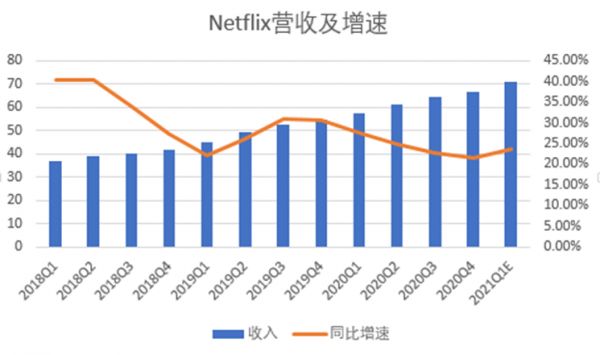 2020年Q4Netflix实现营收66.44亿美元,与去年同期54.67亿美元同比增长21.5%,超出市场预期。Netflix2020全年营收约250亿美元,同比增长24%。