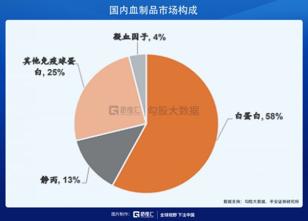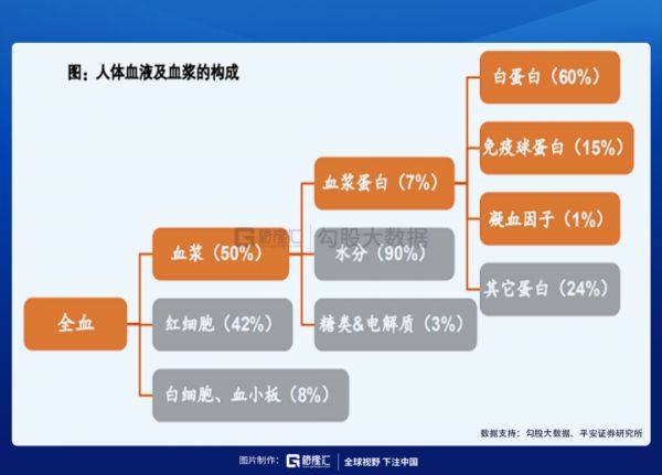 血浆蛋白经过分离纯化可以得到白蛋白、免疫球蛋白、凝血因子和其他蛋白,血浆蛋白由 60%的白蛋白、15%的免疫球蛋白、4%的凝血因子和 21%的其他蛋白成分组成。