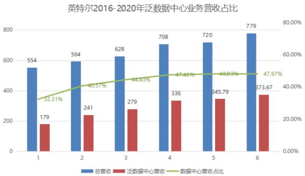 英特尔2016-2020年泛数据中心业务营收占比
