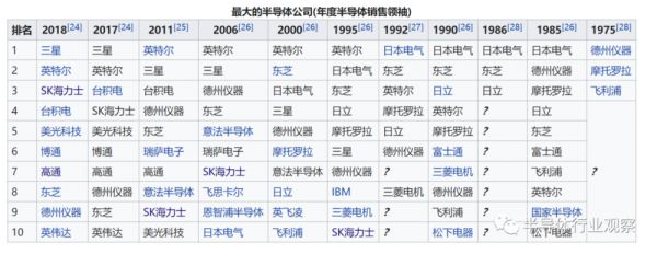 从维基百科上所记录的数据中看,按照销售额计算,晶圆代工的代表——台积电从2011年开始挤进了全球十大半导体企业榜单中。