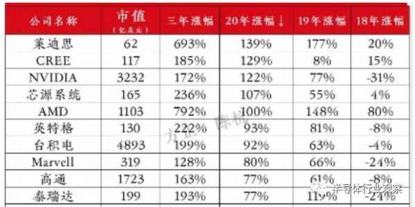 受惠于垂直分工的这种优势,Fabless厂商的身影也开始频繁地出现在了全球十大半导体的榜单中。从上图便可以看出,2011年以后,高通、博通、英伟达等芯片设计公司的出现,表明垂直分工的发展模式在半导体领域中取得了巨大成功。此外,根据方正证券陈航所发布的2020全球半导体涨幅排名的榜单当中,涨幅排名居于前排的几乎都是Fabless厂商。