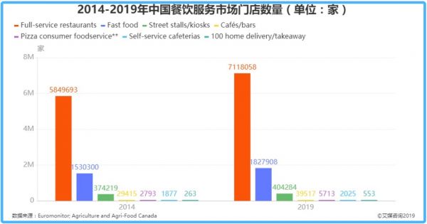 iiMedia Research(艾媒咨询)发布的《2019餐饮行业大数据监测与商业新模式研究报告》显示,2018年中国餐饮业收入已经达到42716亿元,正式进入4万亿元新时代;2014—2019年,中国餐饮服务市场门店数量也呈上升趋势,2019年服务齐全的餐厅门店数量最高达到711.81万家,快餐门店数量为182.79万家,大排档还有40.43万家。