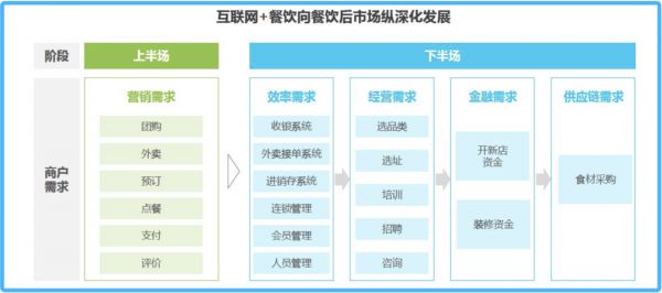 如今,阿里、美团点评两大生活服务平台在餐饮领域已经越来越纵深化。寻求在IT系统、经营、金融到供应链等环节全方位满足商家需求,实现从上游到下游的产业互联网化。
