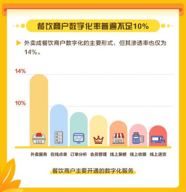 美团研究院发布的《中国餐饮商户数字化调研报告》显示,现阶段餐饮行业数字化服务的渗透率并不高,外卖虽然是餐饮商户数字化主要形式,但渗透率也仅为14%,诸如订单分析、会员管理、线上装修、线上收银、线上进货等数字化服务的渗透率更是低于10%,餐饮行业的数字化转型仍有很大空间。