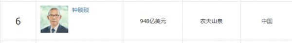 根据福布斯实时富豪排行榜,本文发布之时,钟睒睒个人资产达948亿美元,位居全球富豪榜第6,亚洲富豪榜第1。