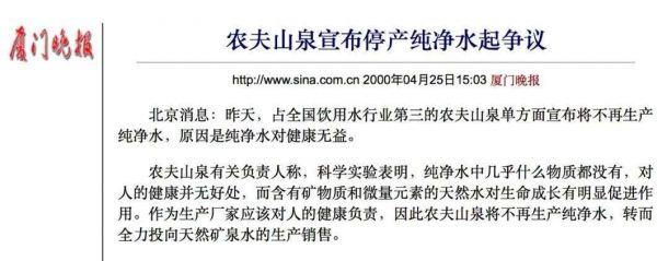 在这场发布会上,钟睒睒公开宣布:因为纯净水对健康无益,农夫山泉不再生产纯净水,全部生产天然水。