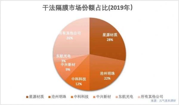 自2017年起,两家公司分别从4%,9%的市占率开始不断减产,于2019年双双告负出局。经过一番惨烈出清,“寡头”格局出现,高工产业网资料整理显示,2019年干法隔膜国内前五大生产厂商占据了74%的市场份额。